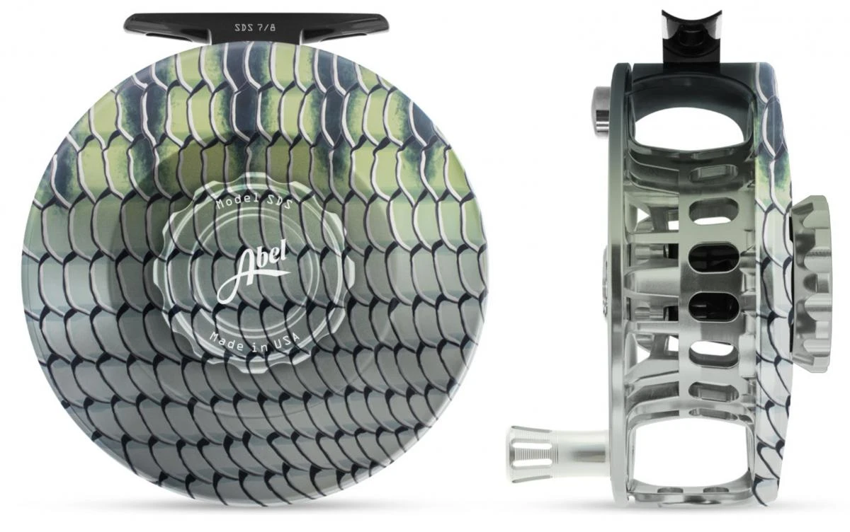 De Abel SDS Solid Bonefish #7/8 Reel voor de lijnklassen #7 en 8 is een vliegenreel die is uitgevoerd met het typische schubbenpatroon en de kleuren van een bonefish op het frame en de spoel.