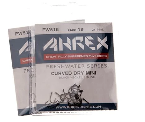 De Ahrex FW516 Curved Dry Mini heeft hetzelfde ontwerp als de Curved Dry Hook van Ahrex, maar met een wat ruimere haakbocht. De FW516 biedt hiermee betere kansen op het haken van een vis, bij het vissen met kleine droge vliegen.