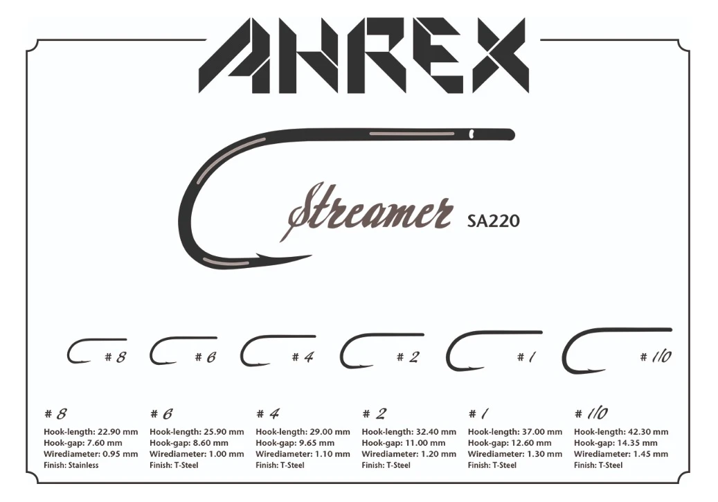 De Ahrex SA220 SA Streamer is een streamerhaak met een rechte haaksteel en een recht haakoog. De SA220 is niet zo lang als een traditionele streamerhaak en gemaakt met een zwaardere draad. Deze haak is een voor de hand liggende keuze voor bijna elke vlieg en is een geweldige allround zoutwaterhaak.