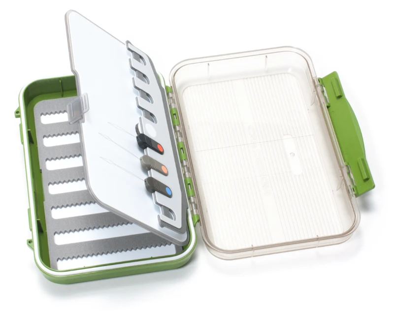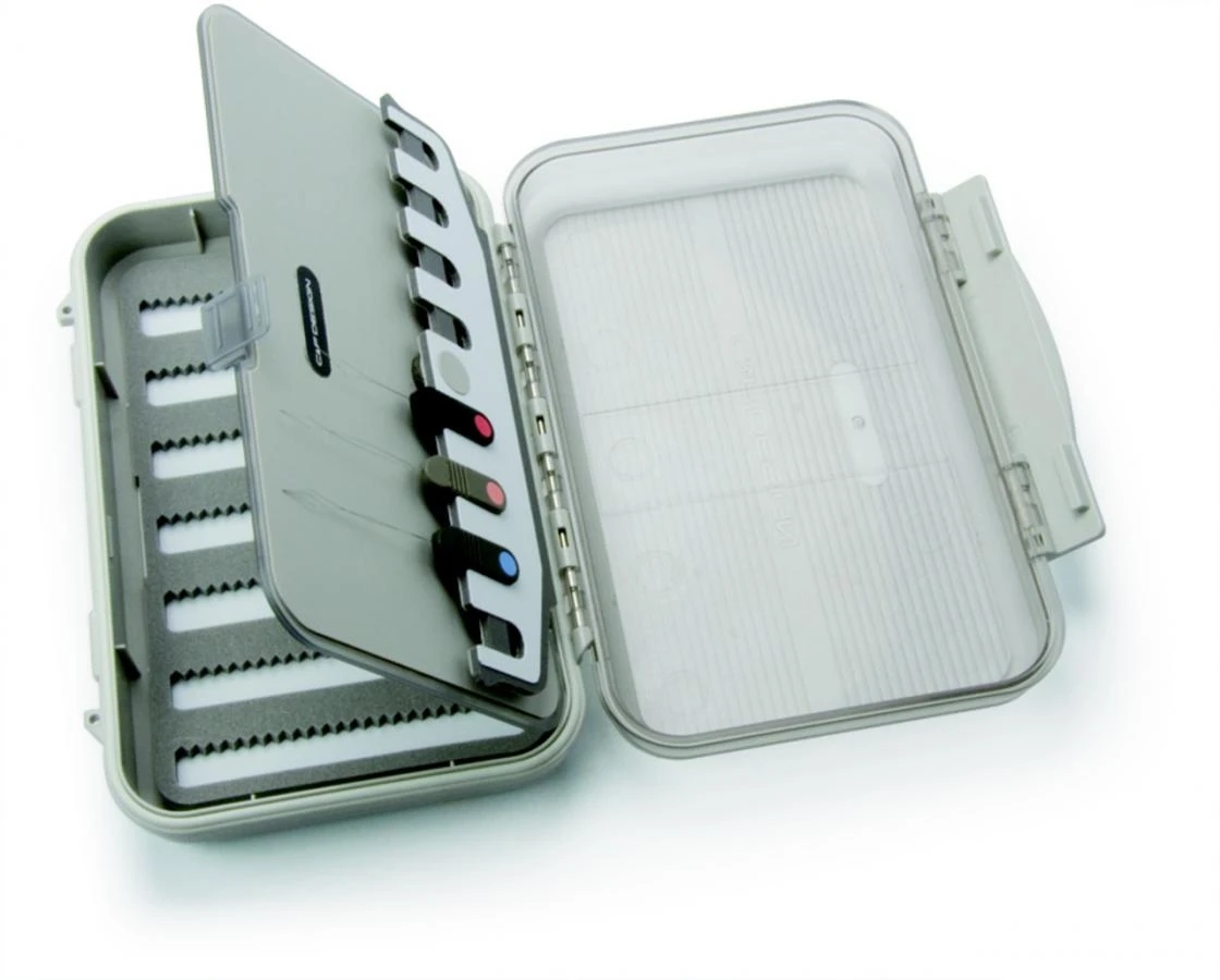 De C&F 14 Row And Threader Clear Top CF-25778CT Waterproof Medium Fly Case is een medium formaat, waterdichte vliegendoos met een doorzichtige deksel, twee Micro Slit Foams die zeven opening hebben aan elke kant voor kleinere vliegen in een haakmaat 12 tot 18. De Threader Holder kant kan acht threaders bevatten. Wordt geleverd met drie Threaders (CF-601,CF-602 en CF-604/S). De C&F 14 Row And Threader Clear Top CF-25778CT Waterproof Medium Fly Case is een uitstekende vliegendoos voor de vliegvissers die al wat meer op leeftijd zijn.