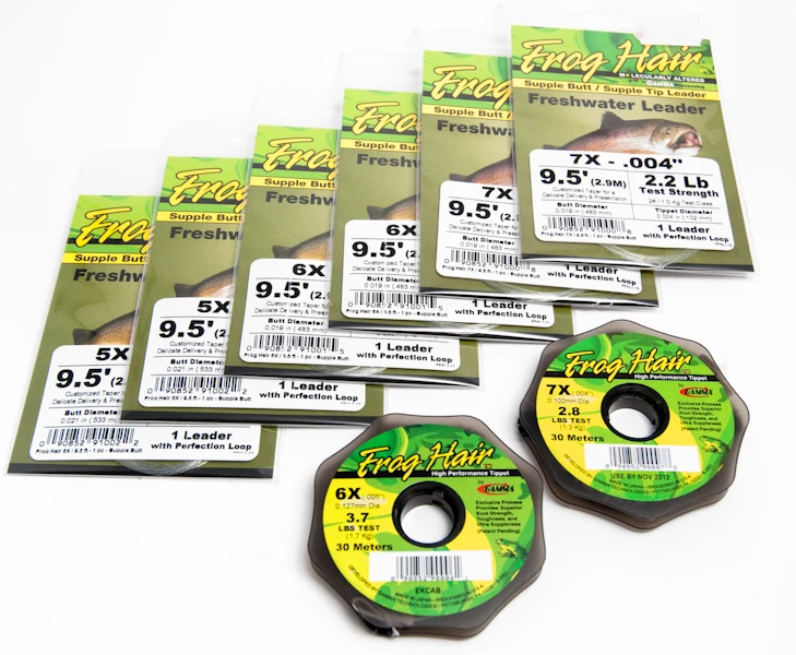 De Frog Hair Set Allround bevat zes leaders van 9,5 voet/290 cm en twee klossen tippetmateriaal van 30 meter in de meest gebruikte maten (zie afbeelding). Geschikt voor forel, baars, vlagzalm, voorn en andere witvis.