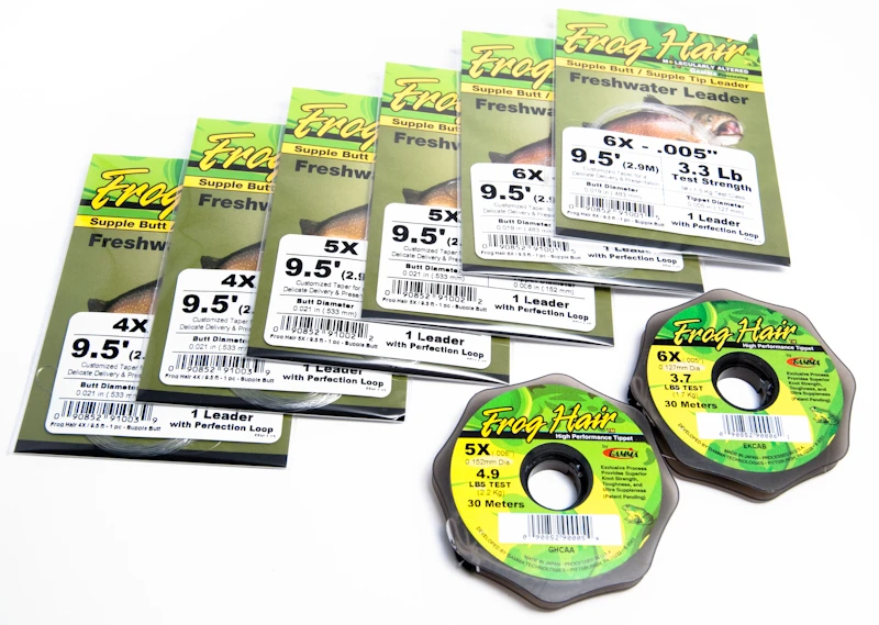 Ga je vliegvissen op forel, vlagzalm of witvis? Bestel dan deze complete Frog Hair Set Trout met leaders en tippetmateriaal. Je kunt met deze set uitstekend uit de voeten op rivieren, beken, forellenvijvers en andere stilstaande wateren. De Frog Hair Set Trout bestaat uit in totaal zes Frog Hair leaders met een lengte van 9,5 voet/290 cm en een dikte aan de punt van 4X, 5X en 6X, daarnaast vind je in de set ook twee spoeltjes Frog Hair leadermateriaal van 5X en 6X.