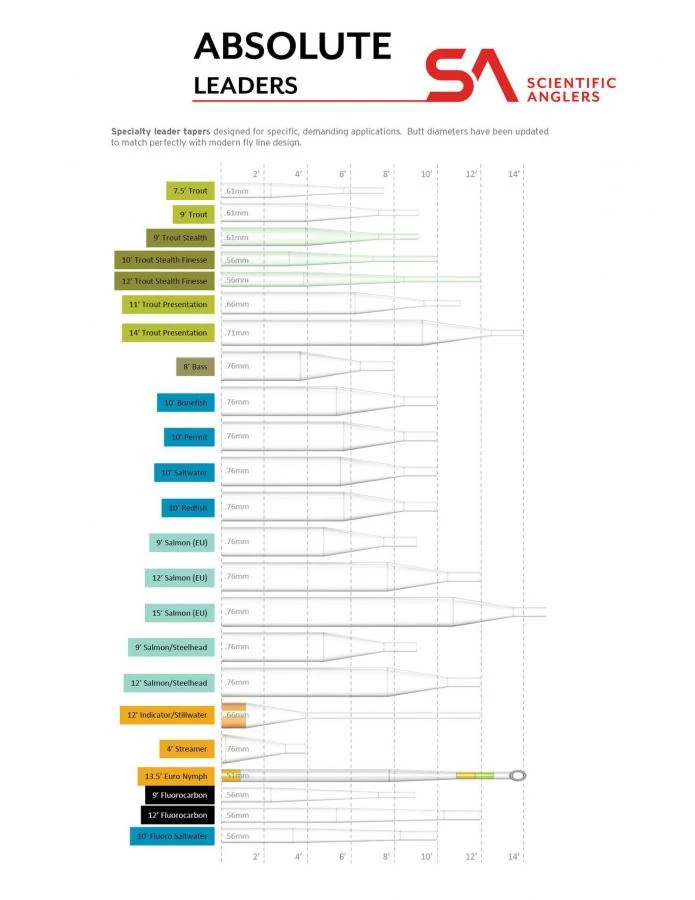 De Scientific Anglers Absolute Bonefish Leaders 10′ zijn vervaardigd van gepatenteerde copolymeer mengsels die ontworpen zijn om veel minder water op te nemen, terwijl de leaders optimaal soepel blijven met een hoge trekkracht op de knopen. De Absolute Bonefish Leaders in een lengte van 10 voet/300 cm hebben een 29% hogere trekkracht op natte knopen vergeleken met eerdere uitvoeringen en tot wel 40% meer trekkracht op natte knopen wanneer deze vergeleken wordt met leaders van andere producenten.