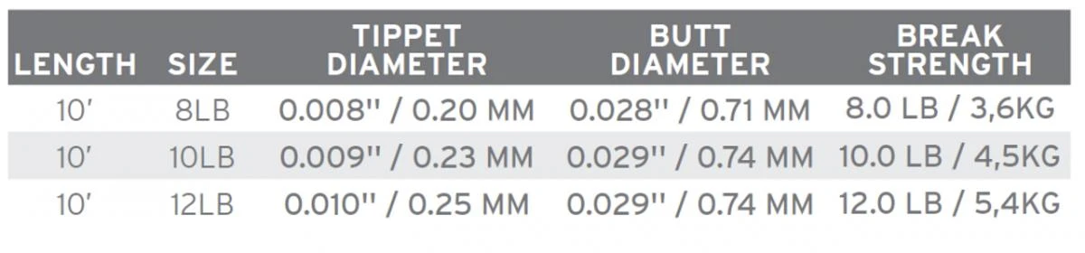 De Absolute Bonefish Leaders 10′ zijn beschikbaar met leaderpunten van 8 lb/3,6 kg – 20/00, 10 lb/4,5 kg – 23/00 en 12 lb/5,4 kg – 25/00.