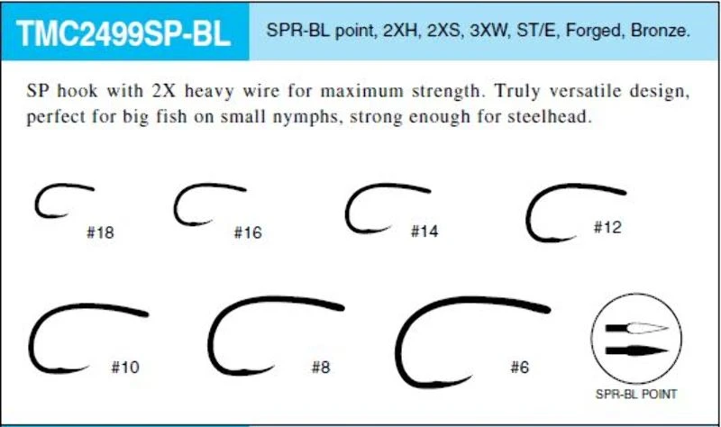 De Tiemco TMC 2499SP-BLB Black Dry Fly & Nymph Hooks zijn ontworpen op basis van TMC 2488, maar met een 2X zware draad voor extra sterkte, zoals op TMC 2457SP-Barbless punt (ronde punt).